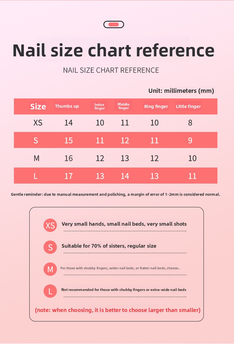 - If your measurement falls between two sizes: Opt for the larger size. You can gently file the edges with a nail file to trim it down for a perfect fit.